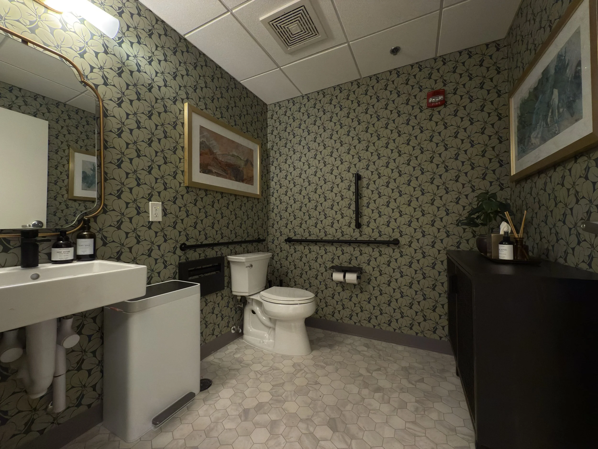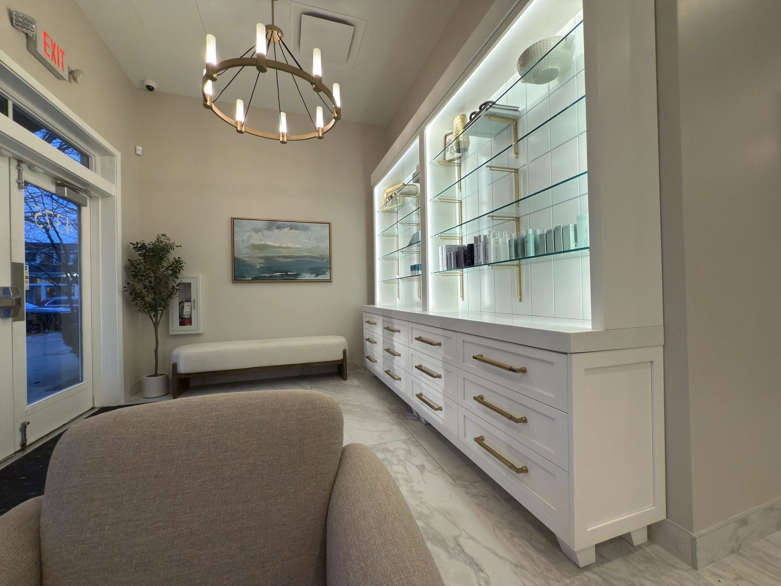 The renovation opened up the space and refined the layout to improve flow while introducing a more elevated atmosphere throughout. Large-format tile, vinyl wall coverings, and custom-built millwork were carefully integrated to bring texture, depth, and a sense of comfort to each treatment and retail area.